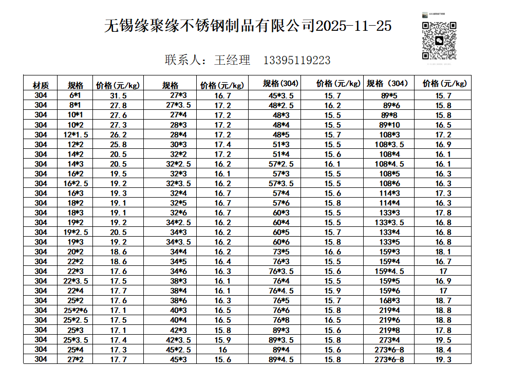 不銹鋼無縫管價格表